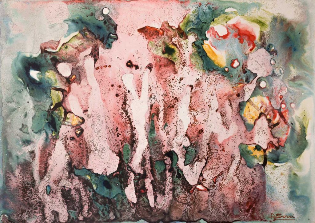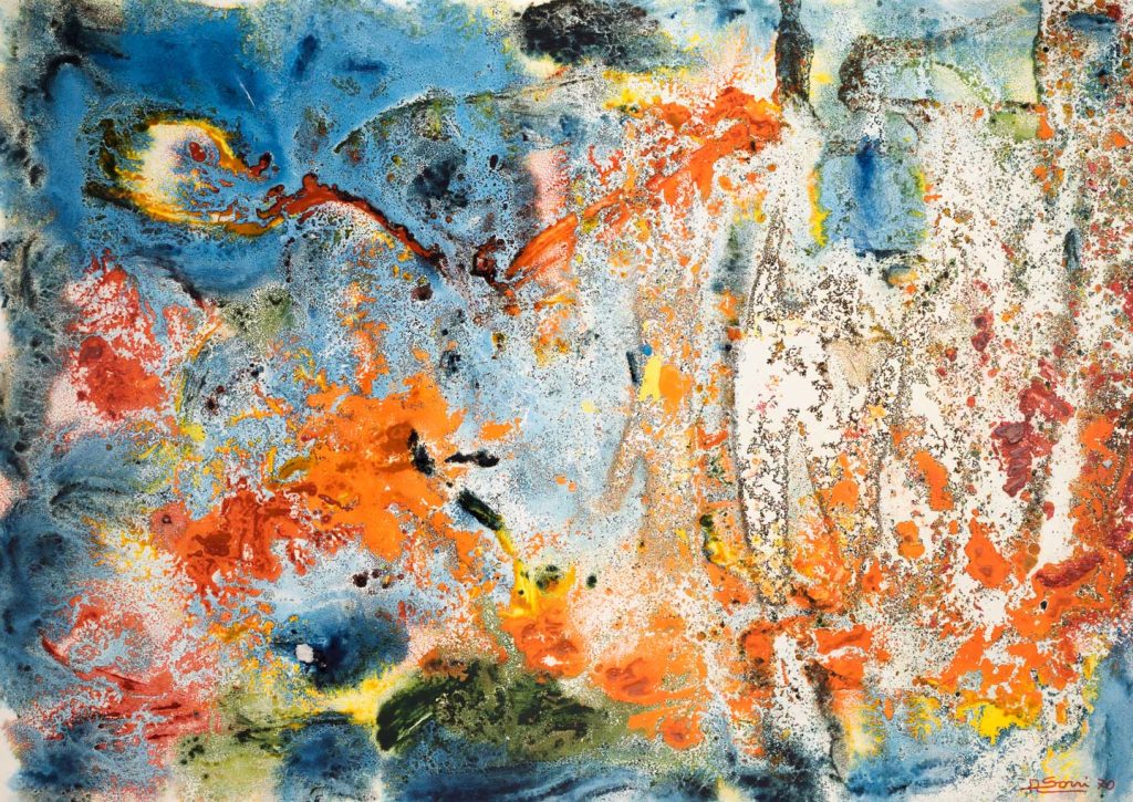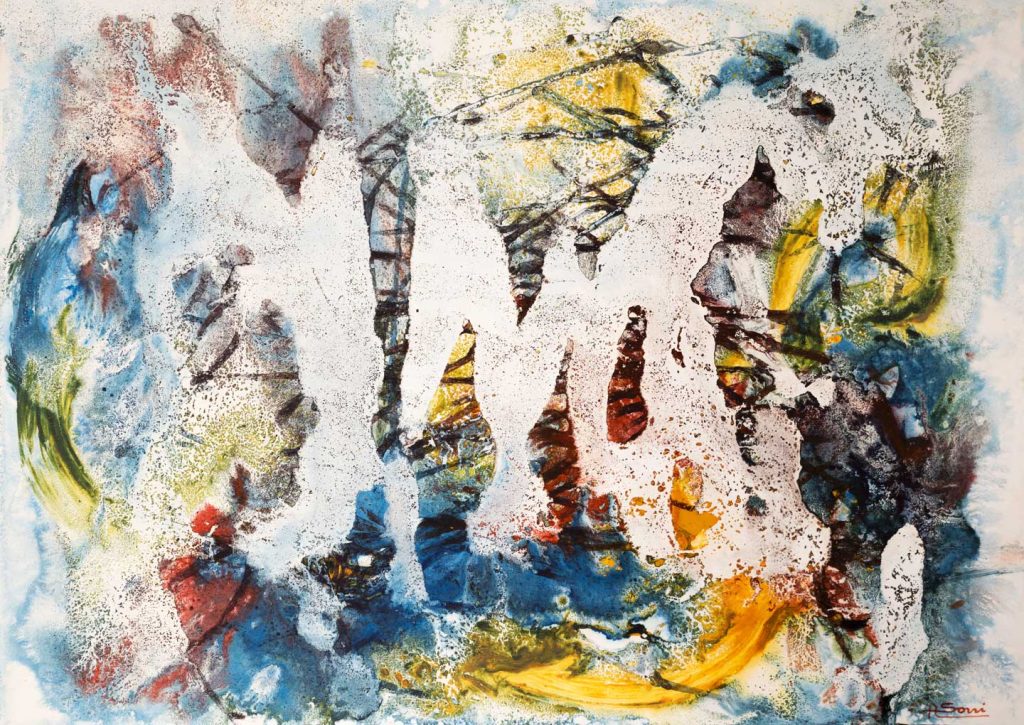 The Informali series comes at the beginning of the sixties, years in which artistic trends converge towards an increasingly intense dematerialisation of the object. Experiments on colour and shape are also becoming stronger in Sozzi. “His” space expands and expands by looking at nature as a fluid material that reflects itself, where inner spaces merge with the outside world. Here the seabed echoes cosmic constellations, glowing magma follows in the footsteps of sunny deserts.